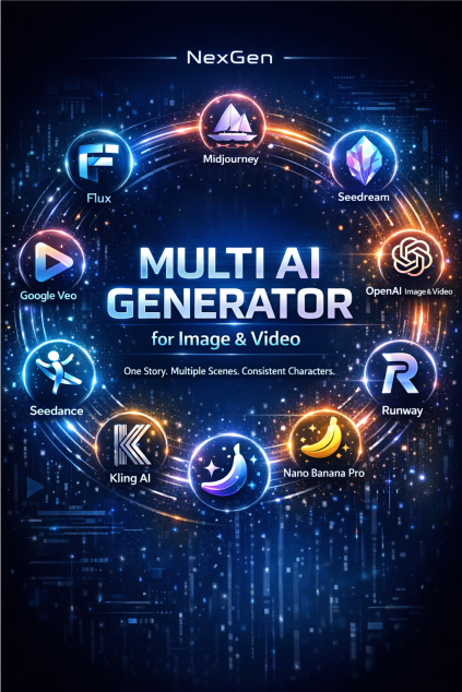 NexGen adalah Multi AI Generator yang dirancang khusus untuk kreator konten, advertiser, dan video creator yang ingin membuat video AI realistis tanpa kamera, tanpa aktor, dan tanpa proses ribet.