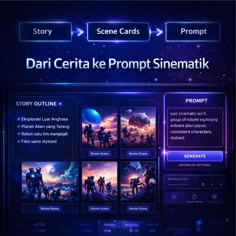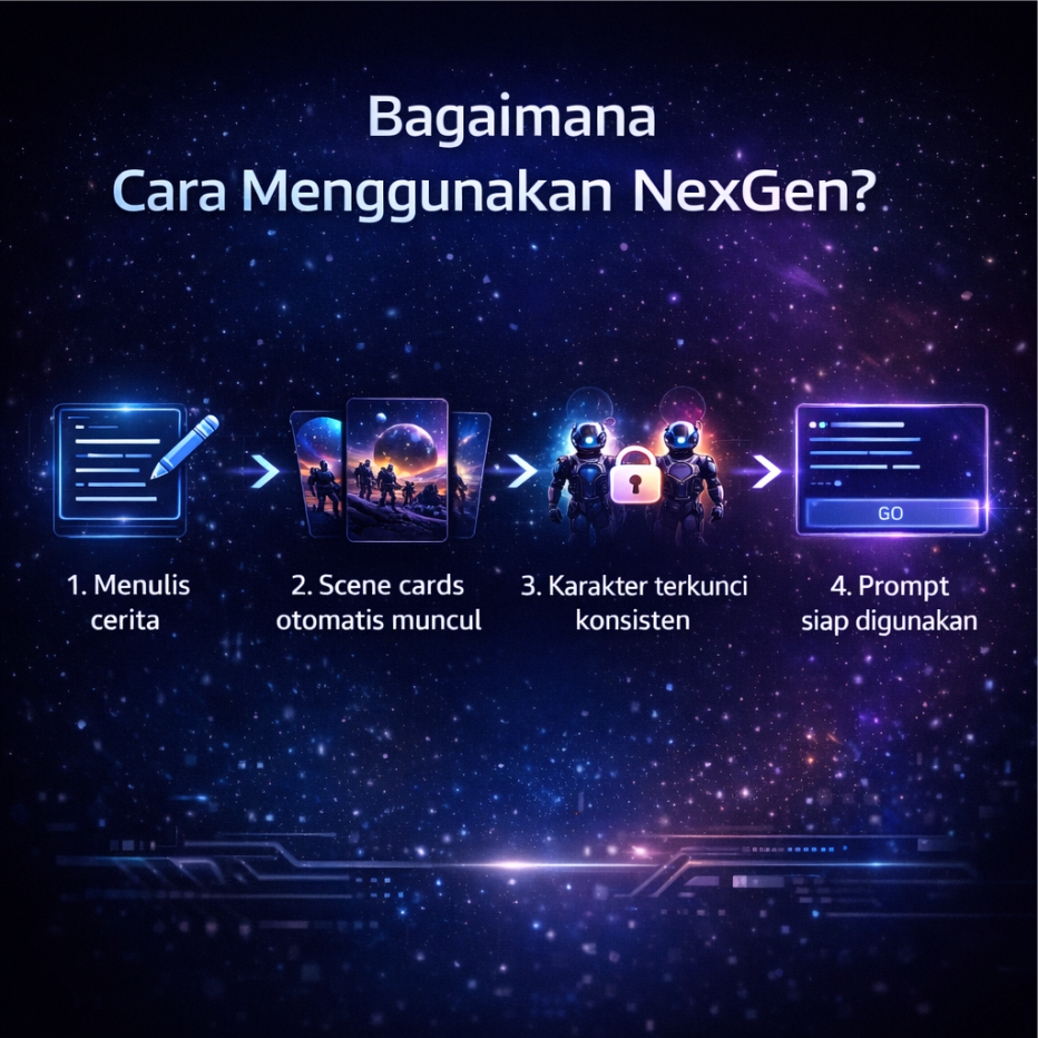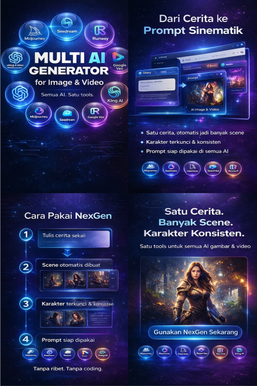 NexGen akan mengubahnya menjadi prompt video terstruktur dengan alur jelas dan karakter konsisten, siap digunakan untuk berbagai kebutuhan konten dan iklan.
